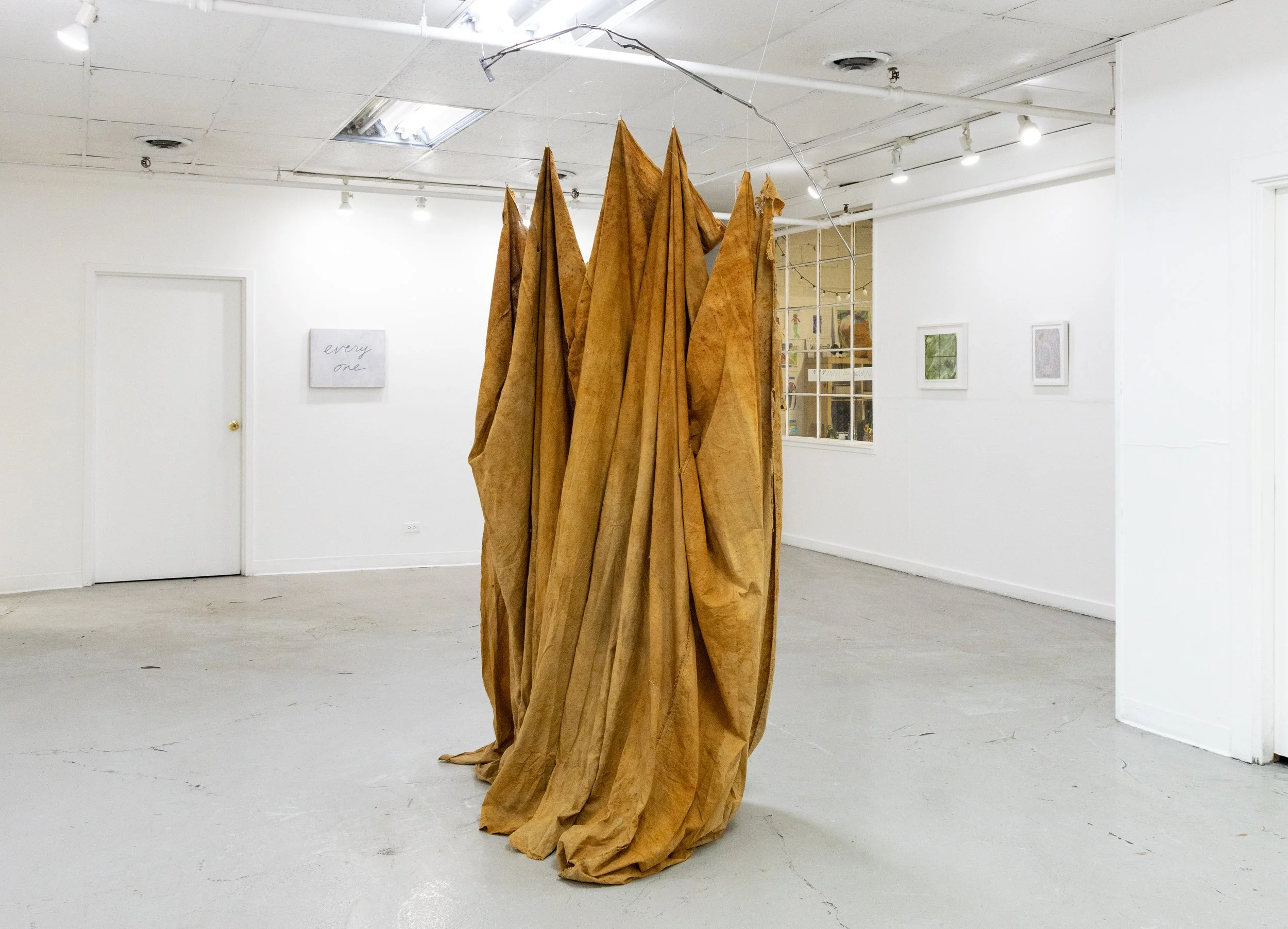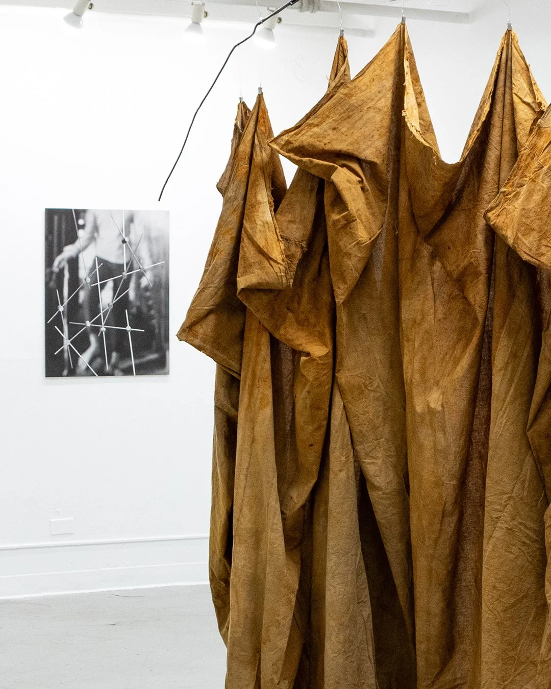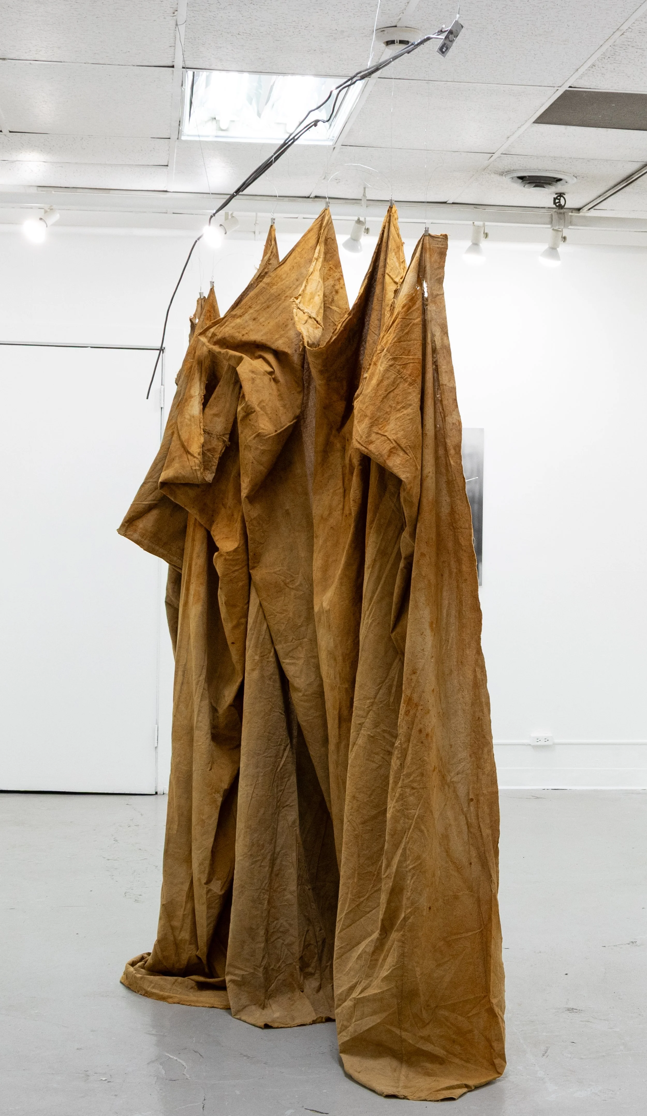Iron, bleach, and vinegar on muslin, metal clips, steel, binding wire